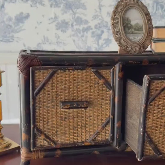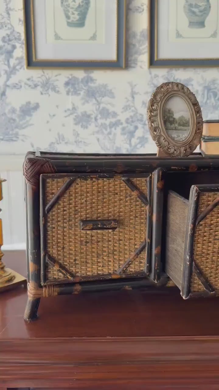 Crafted from real bamboo with woven rattan fronts and finished in a rich tortoiseshell lacquer, this three-drawer chest has the beautiful mottled patina collectors love — darker, deeper, and far more dimensional than standard blonde bamboo. The tone gives it warmth and character right away, the kind of depth only time creates.