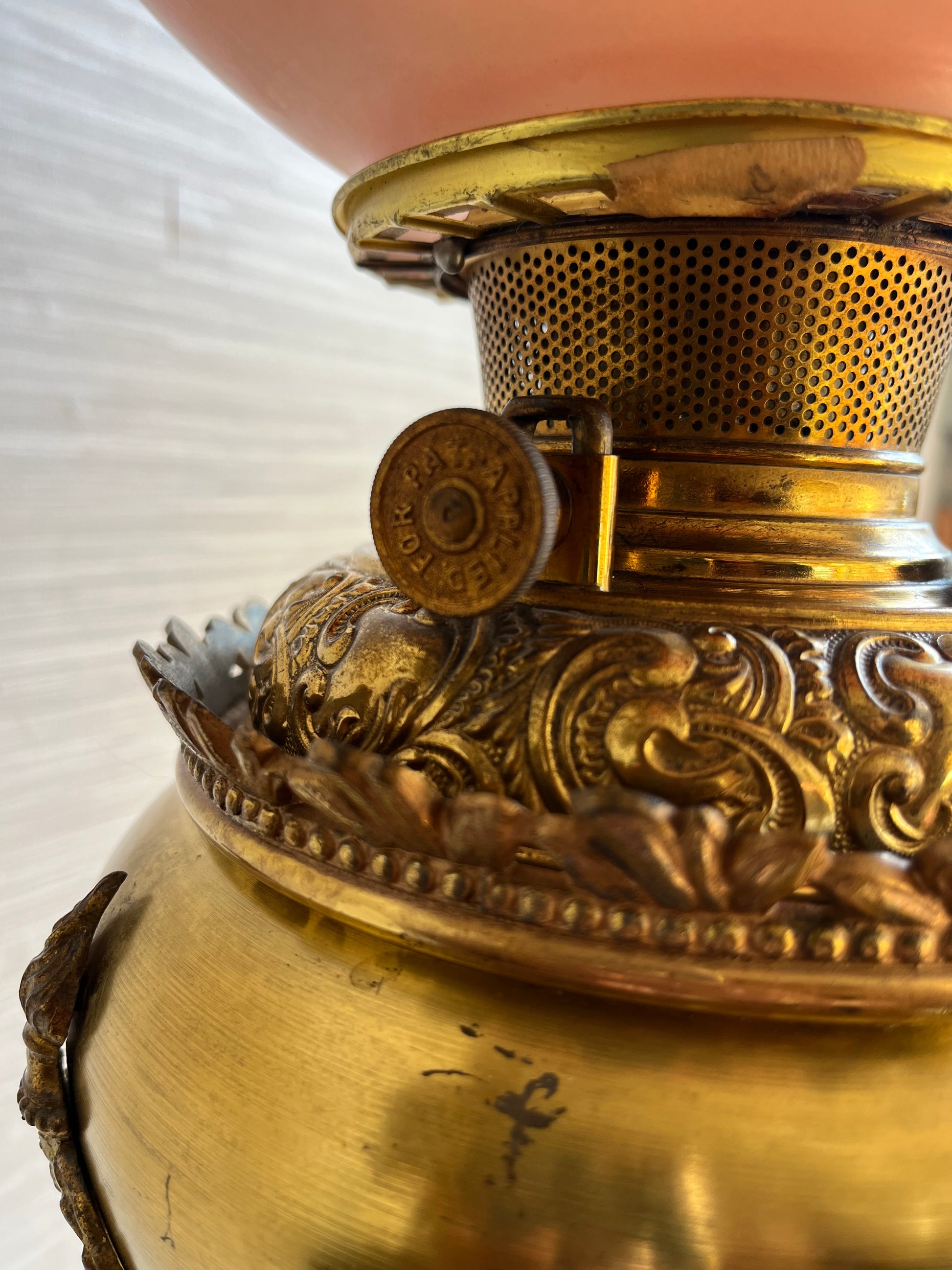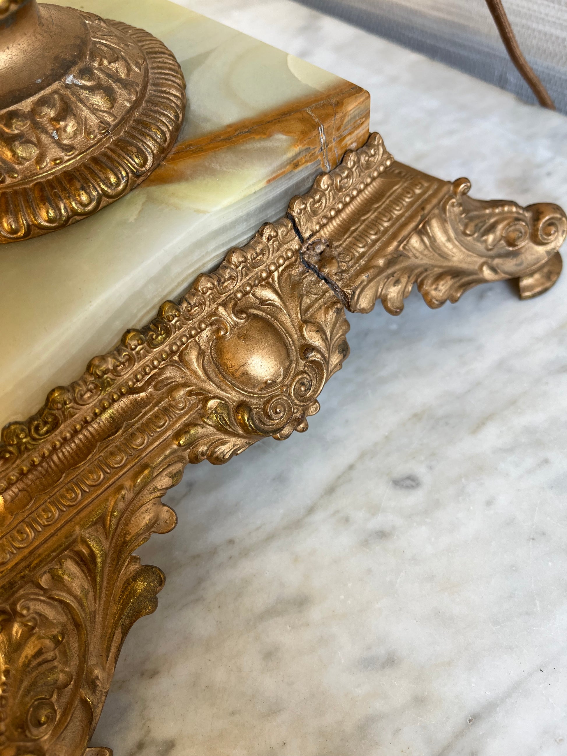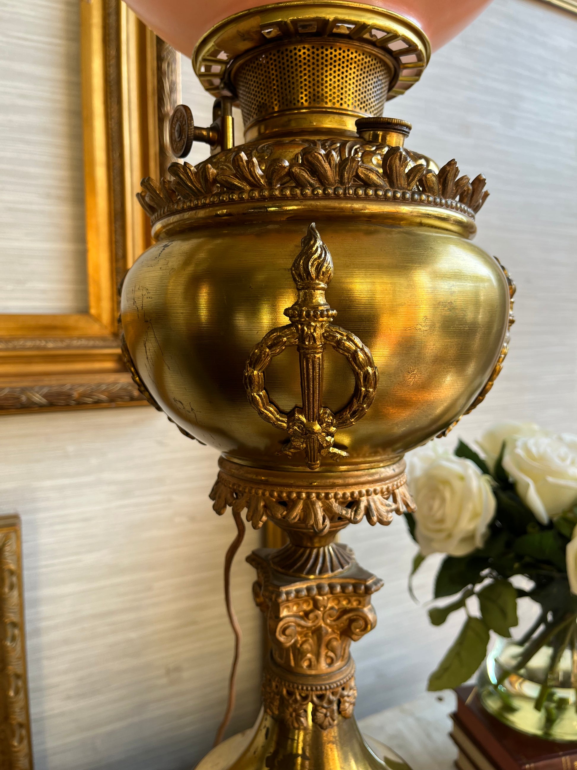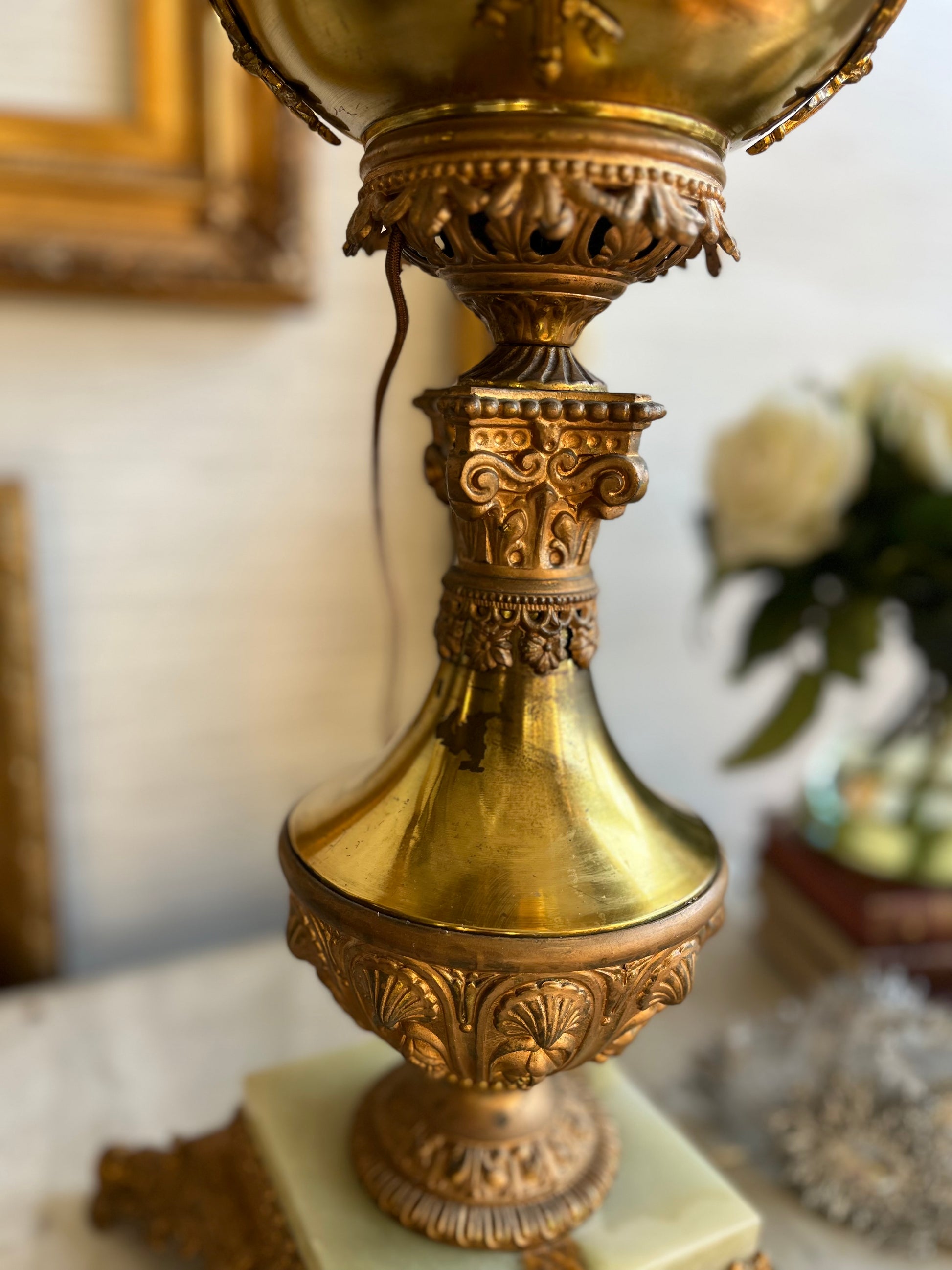 At its foundation, the lamp features an onyx base, a prized material of the era, known for its solidity and luxurious appeal. The lamp's structure is further enhanced by a wealth of ornate brass details—scrolls, flourishes, and classical motifs—all typical of the Victorian pursuit of beauty and elegance.