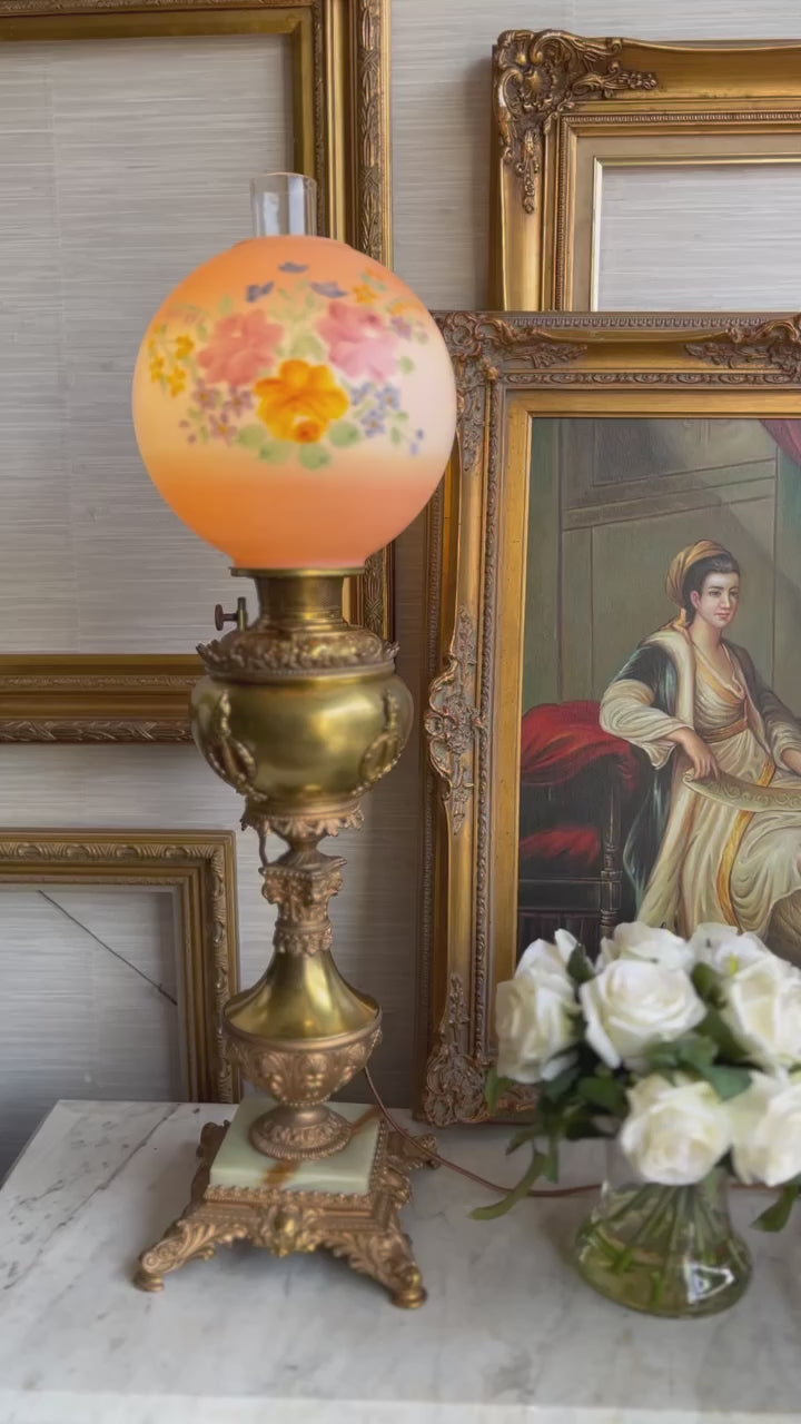 Provenance: Originally, these lamps were designed to burn oil. They had a central burning wick, with the oil reservoir housed below the globe. The beautiful hand-painted globes served not only as a light diffuser but also as a decorative piece, showcasing the Victorian era's love for ornamentation and artistry in everyday objects. They were typically used in parlors and were a sign of status and elegance. This lamp once belonged to a sprawling Victorian estate built in 1875 and was purchased at an antique auction house in Norfolk, VA.