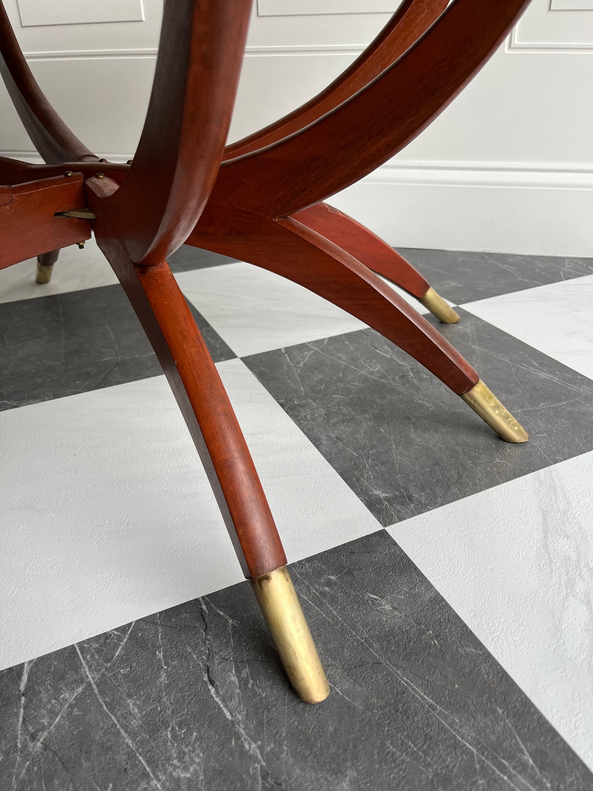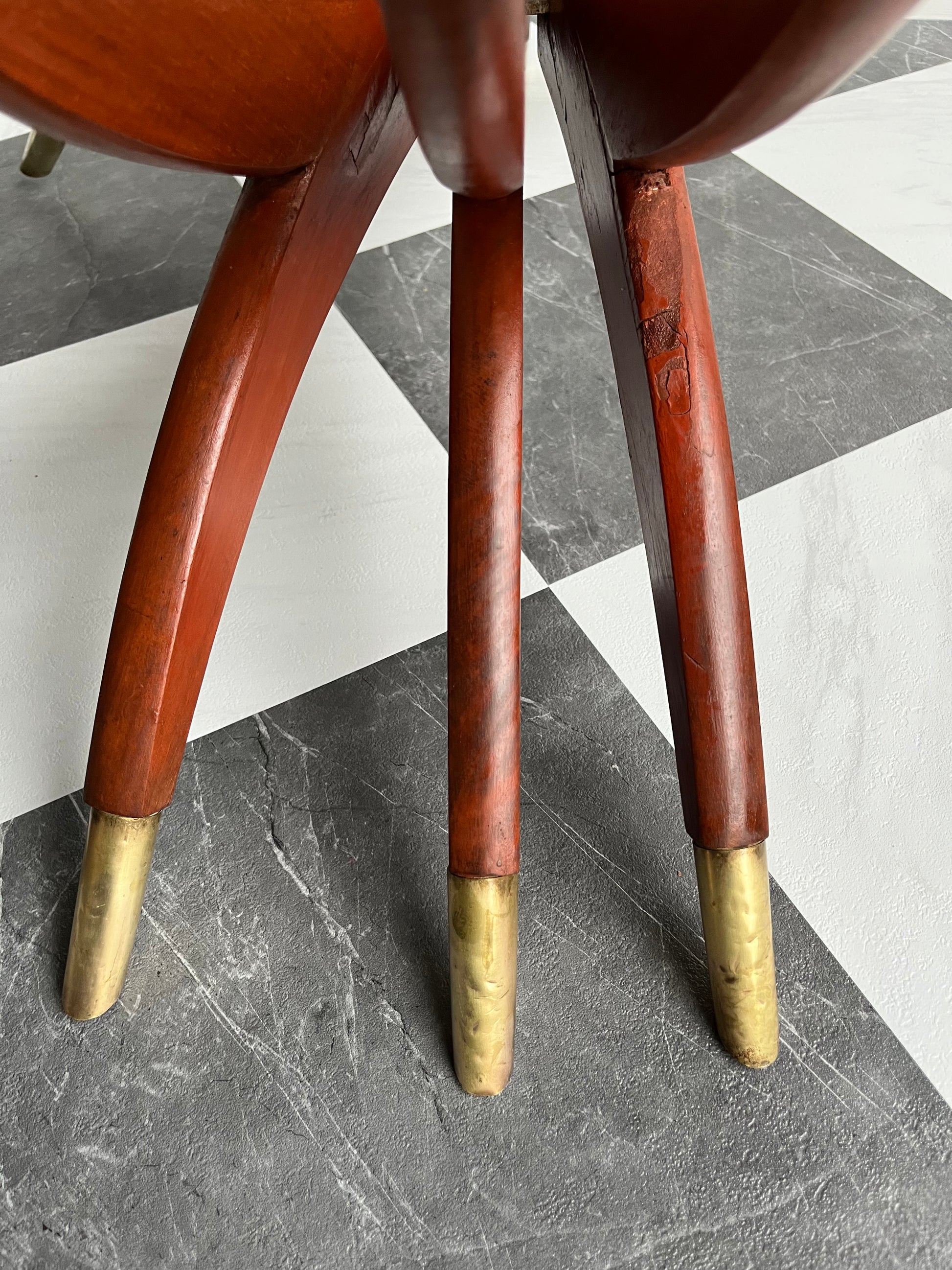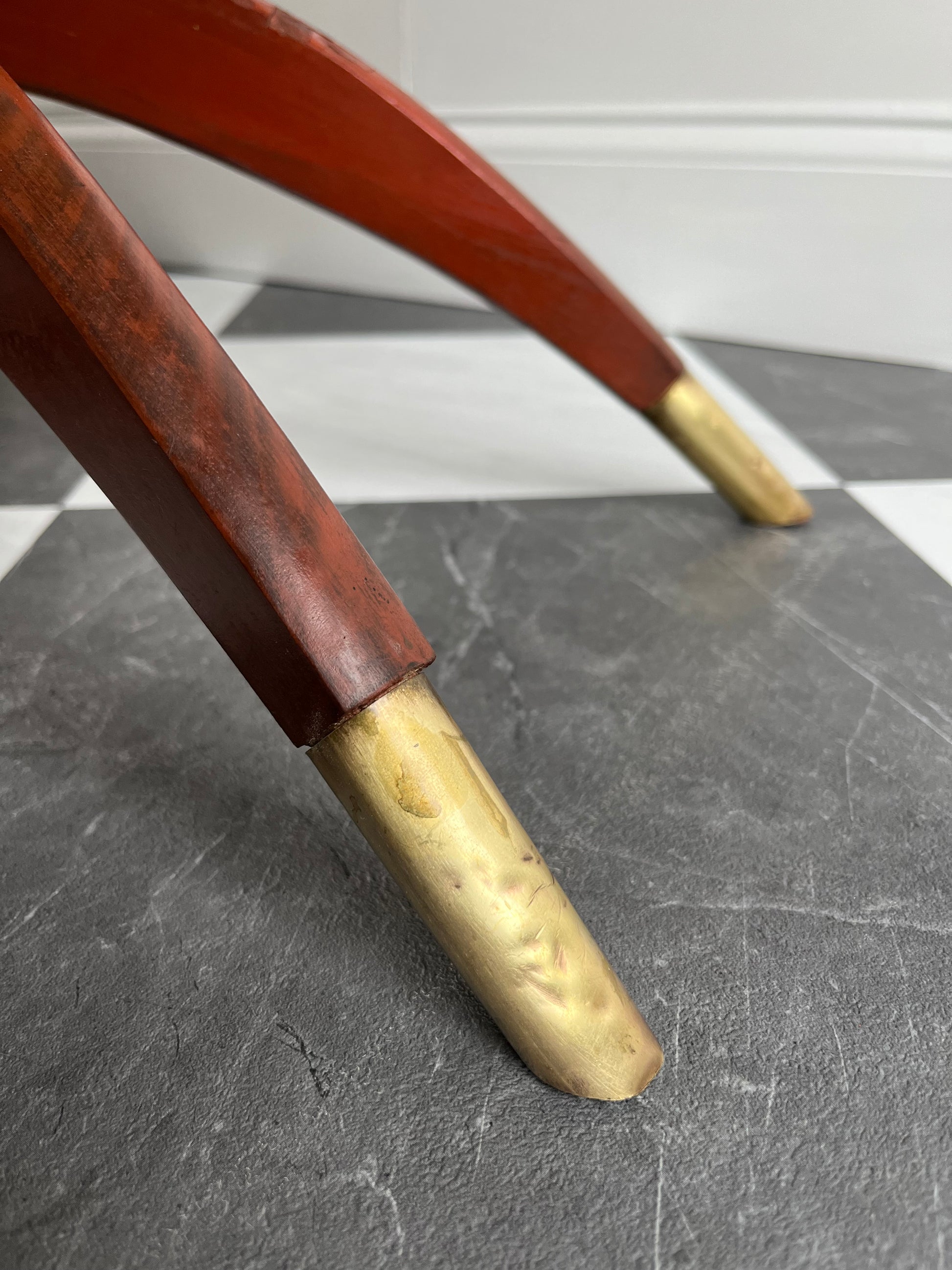 The finish on the legs shows some expected age, including faint hairline marks in the wood grain—subtle surface character that adds to its vintage soul without affecting its stability. The brass caps on the feet show light dents, and the top has some gentle wear and patina, all consistent with a piece of this age.