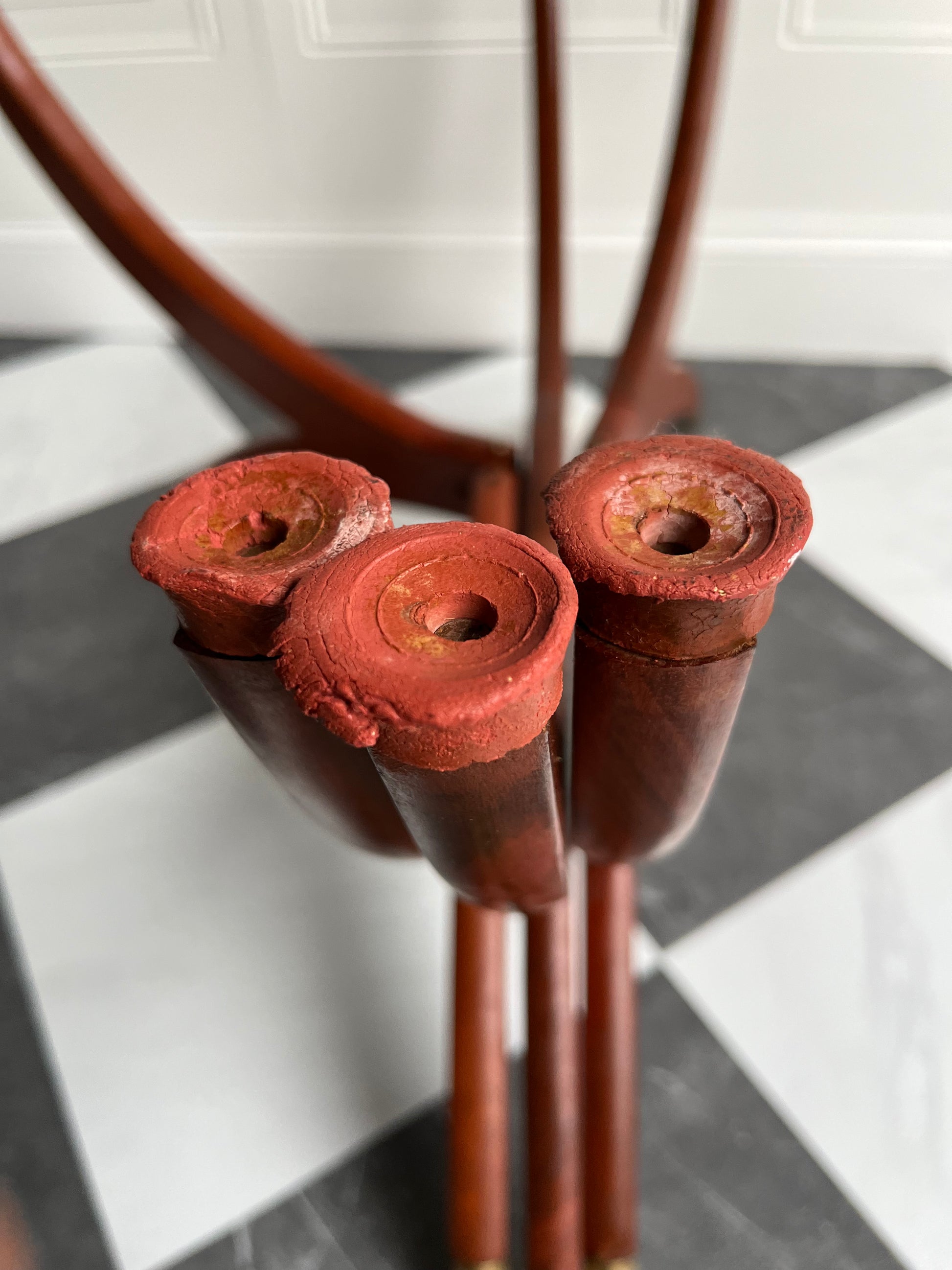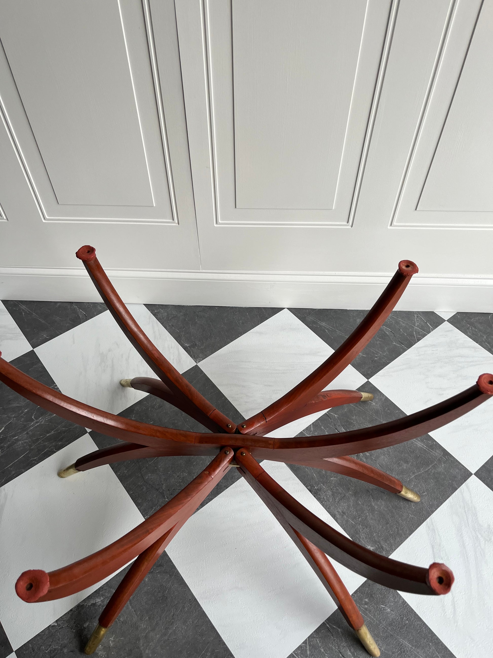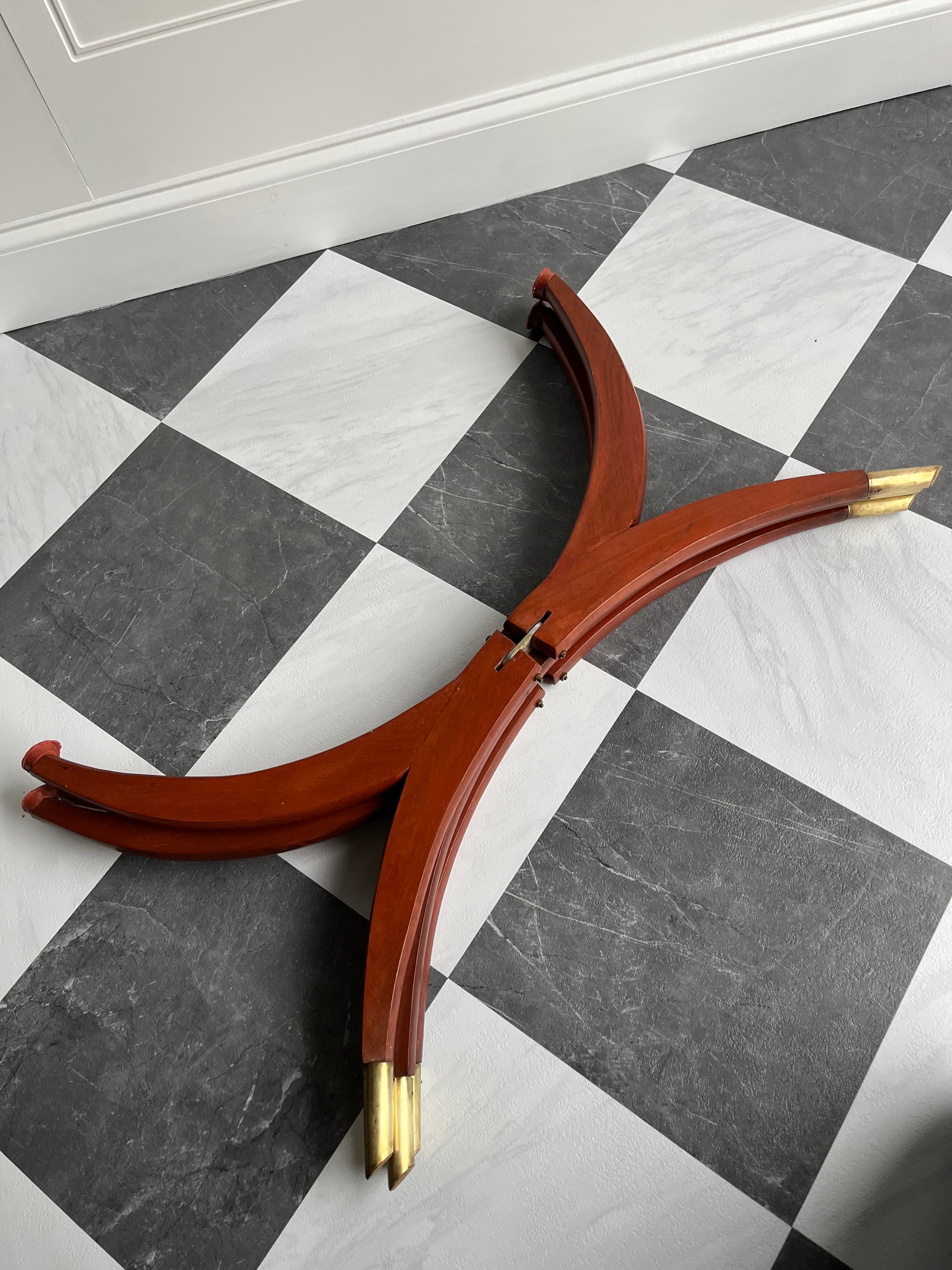 The finish on the legs shows some expected age, including faint hairline marks in the wood grain—subtle surface character that adds to its vintage soul without affecting its stability. The brass caps on the feet show light dents, and the top has some gentle wear and patina, all consistent with a piece of this age.
