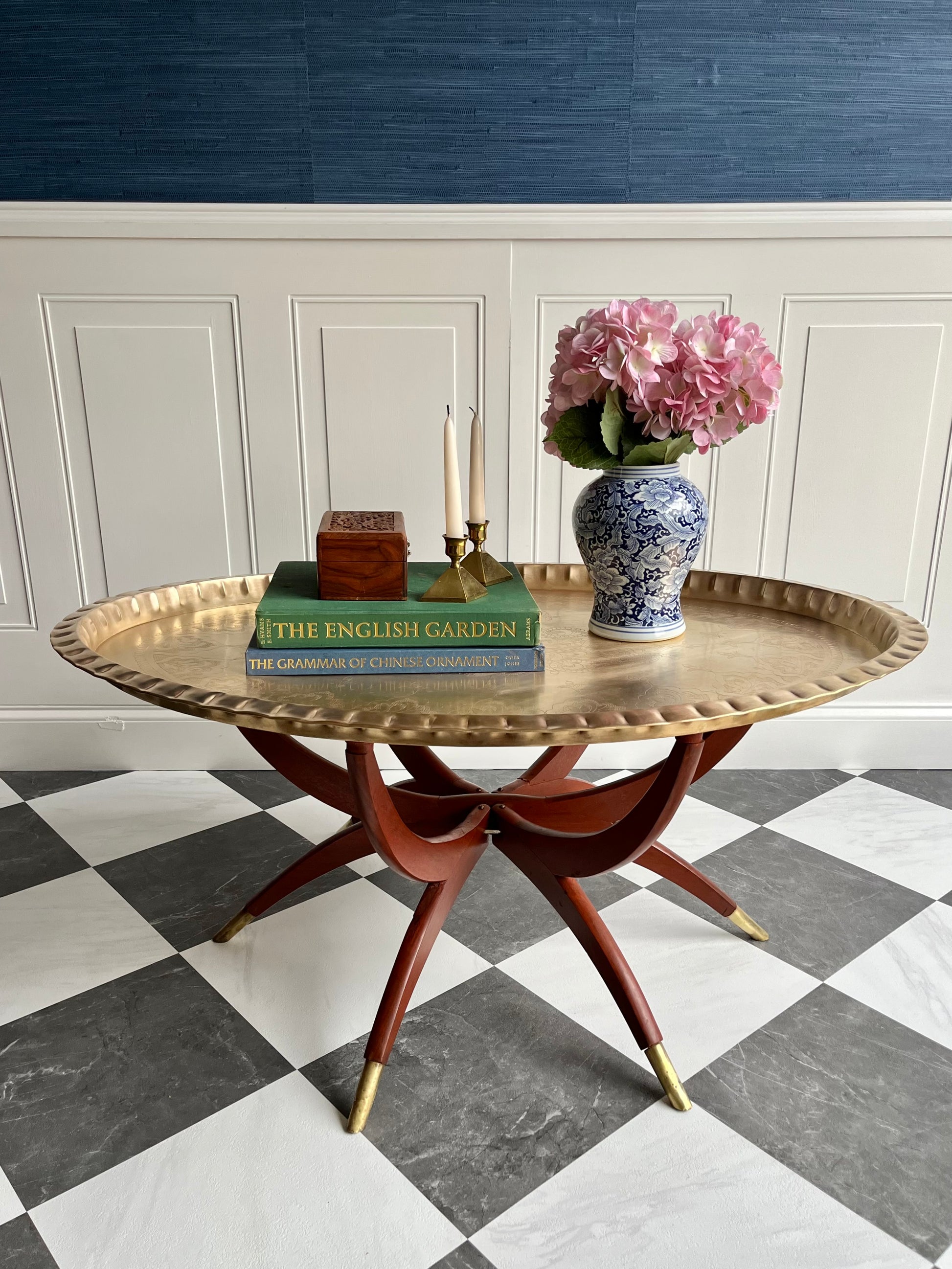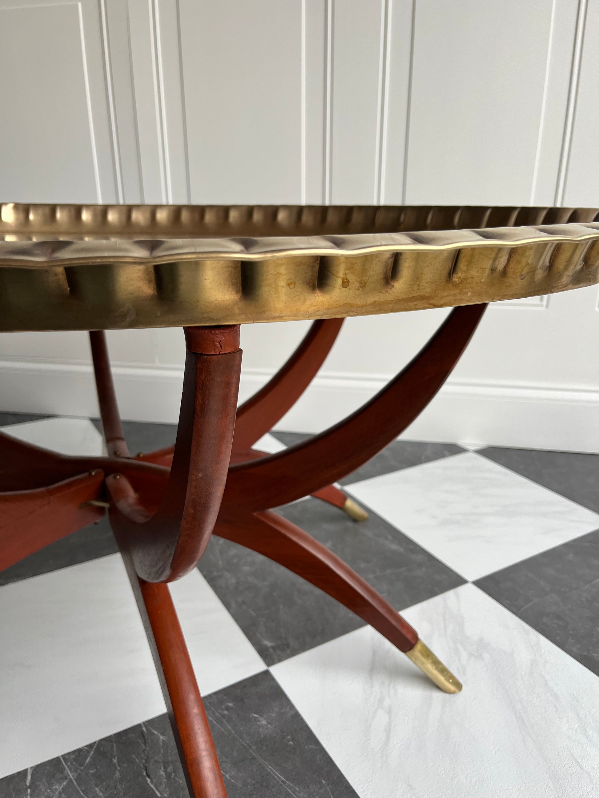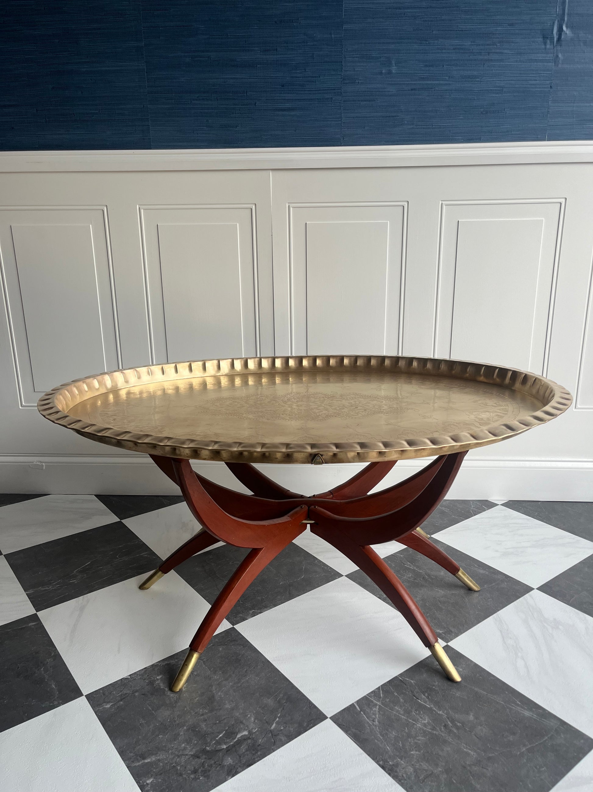 Lovely Vintage Hand Etched Brass & Mahogany Tray Coffee Table With Folding Spider Legs | Made In Hong Kong Circa 1960s
