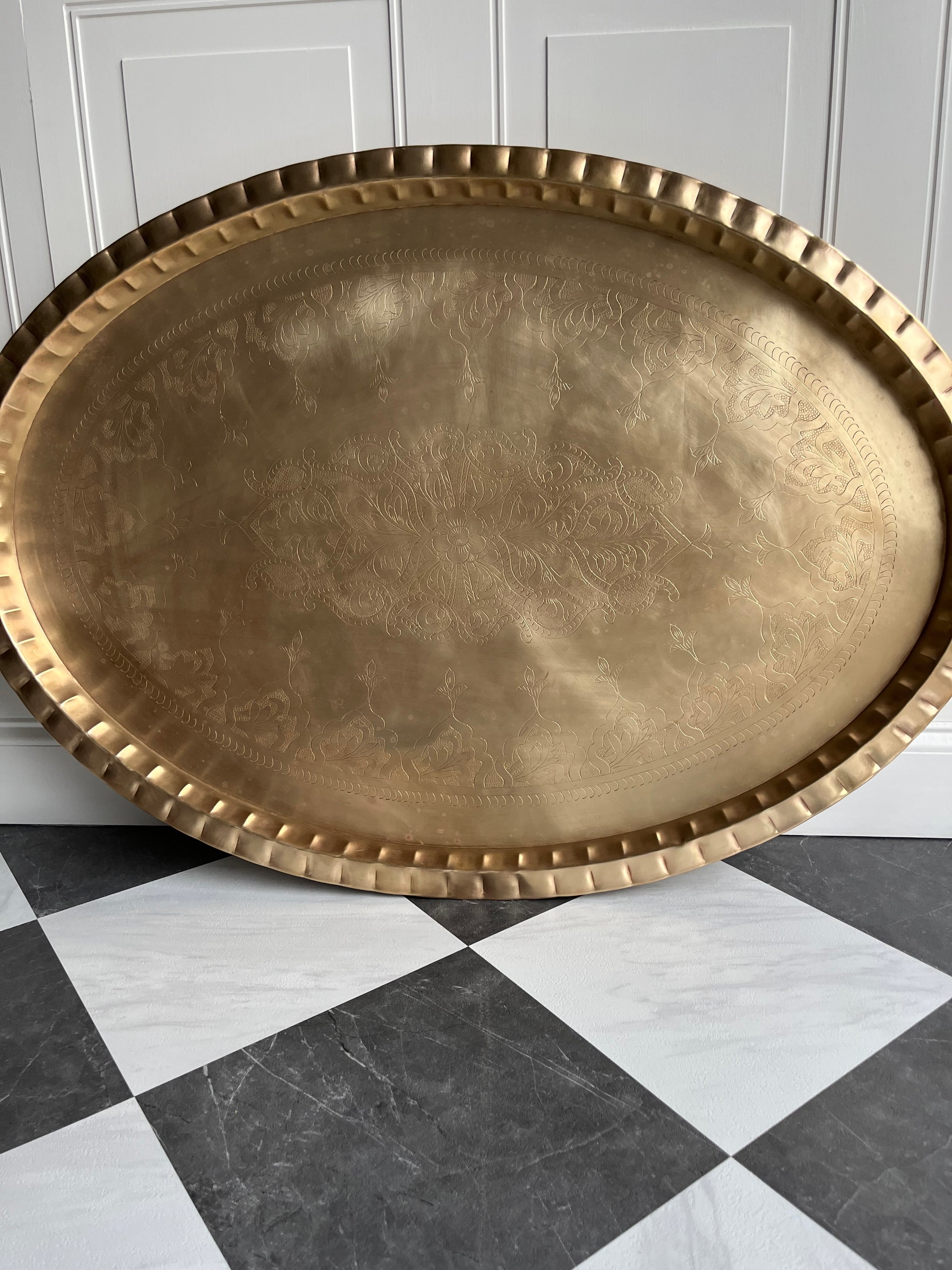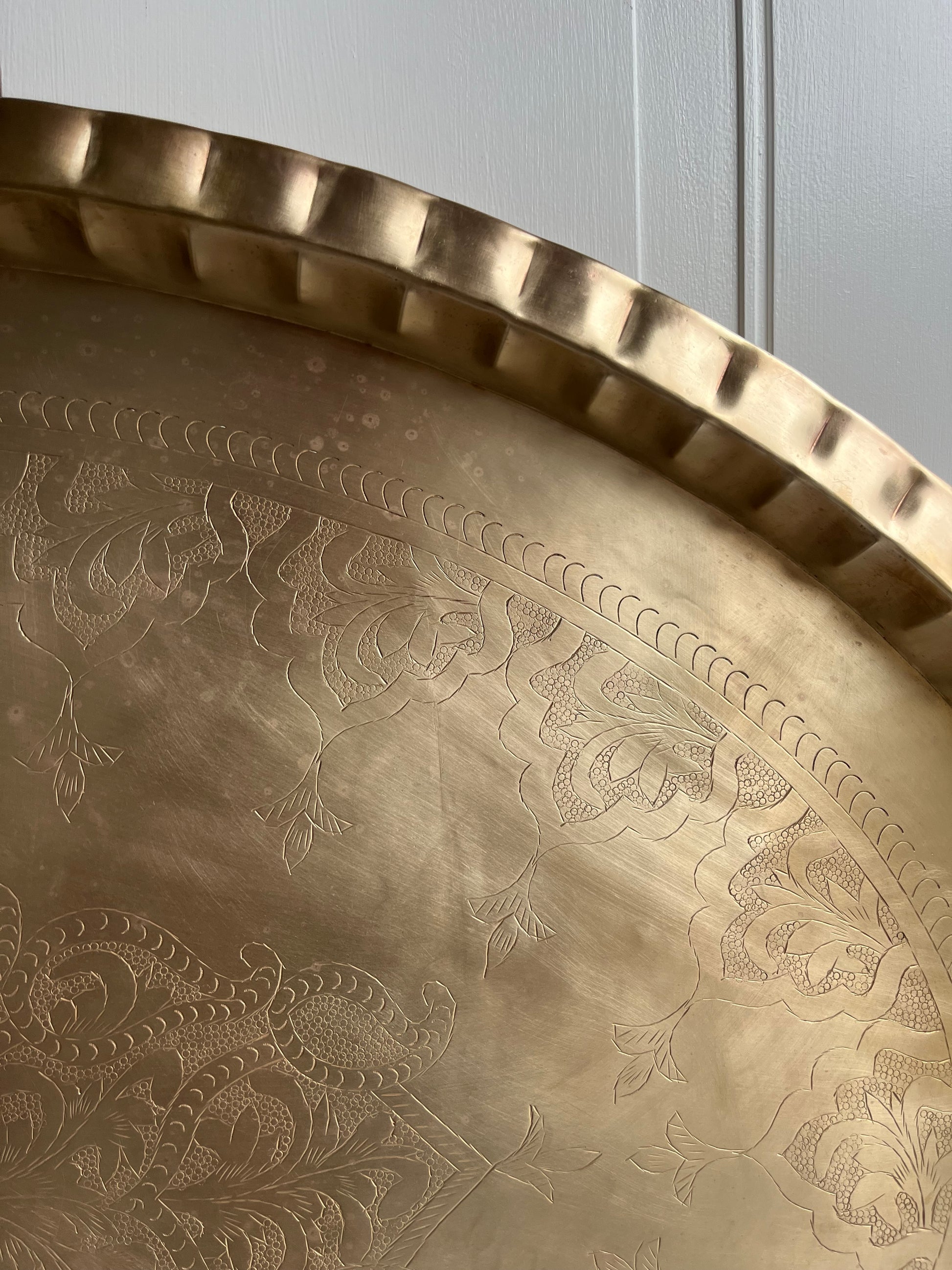 A true conversation piece, this vintage folding coffee table offers beauty, charm, and versatility in one stylish package. The solid brass tray top is scalloped and etched with delicate patterning, giving it an ornamental look that feels just as fitting in a well-collected living room as it does styled casually on a sun porch or patio.
