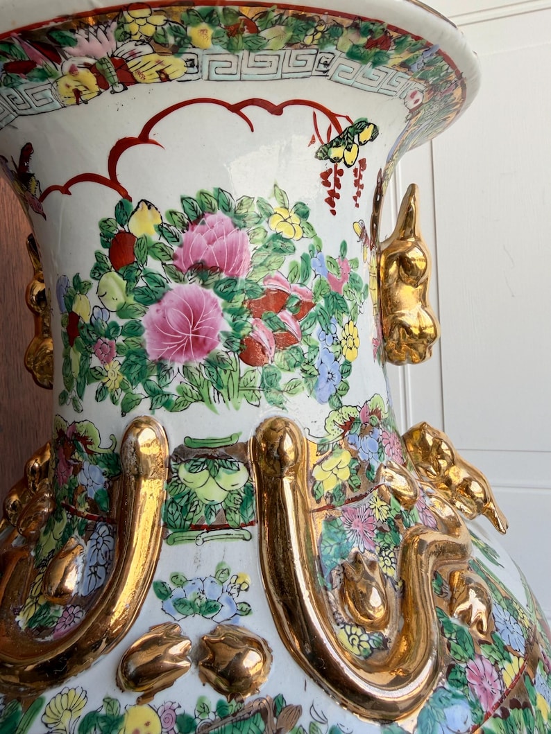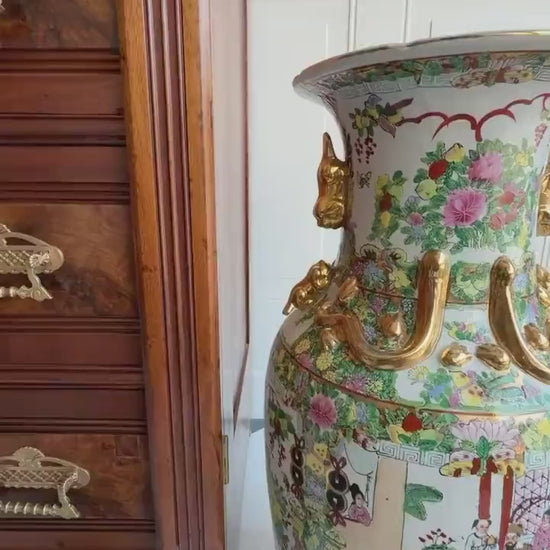 Grand Chinese Famille Rose Canton Floor Vase | 24" Hand Painted Porcelain with Gilt Foo Dog Handles