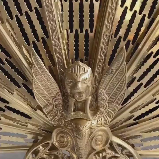 Designed in a graceful fan shape, the pierced brass panels open wide to protect the hearth while allowing light and warmth to flicker through, casting a gentle golden glow across the space. When closed, it stands neatly like a sculptural accent beside the fire. The brass has a rich, naturally aged patina and a reassuring weight in hand — substantial, enduring, and beautifully made.
