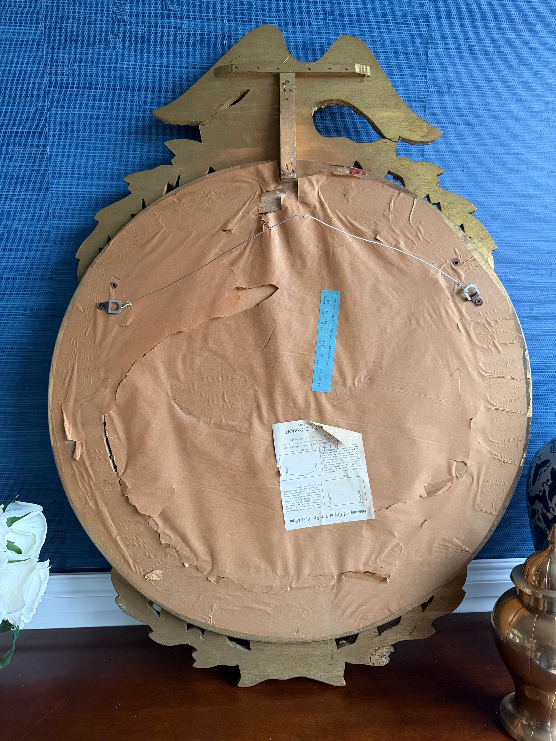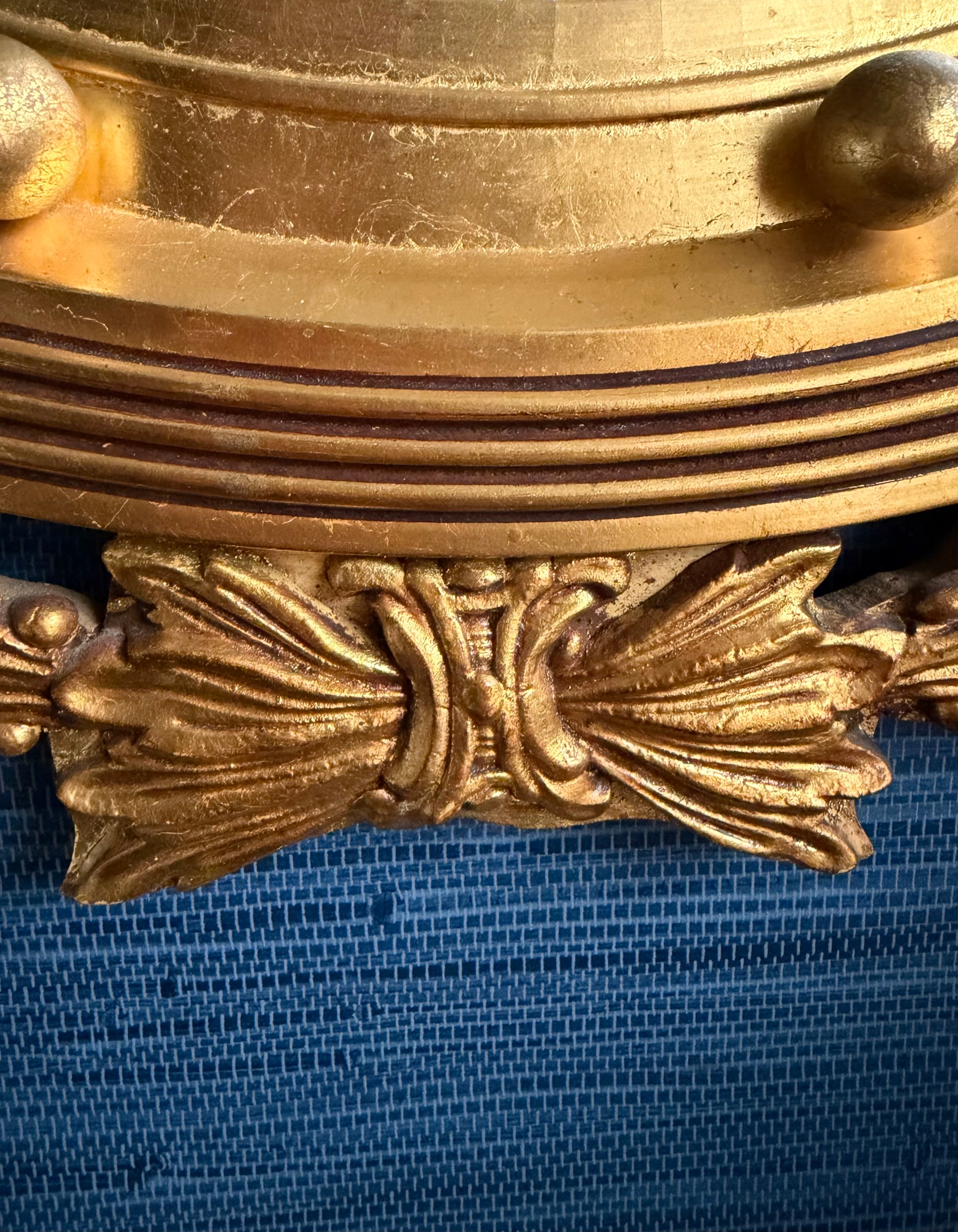 This example features a convex mirror plate surrounded by the iconic thirteen gilded balls, symbolizing the original 13 colonies and a unified nation. The frame is wood with gesso overlay and a warm gilt finish that visually echoes period gold leaf. The pronounced eagle crest and acanthus leaf flourishes reflect the patriotic neoclassicism that defined Federal design and later enjoyed a revival during the early-mid 20th century.