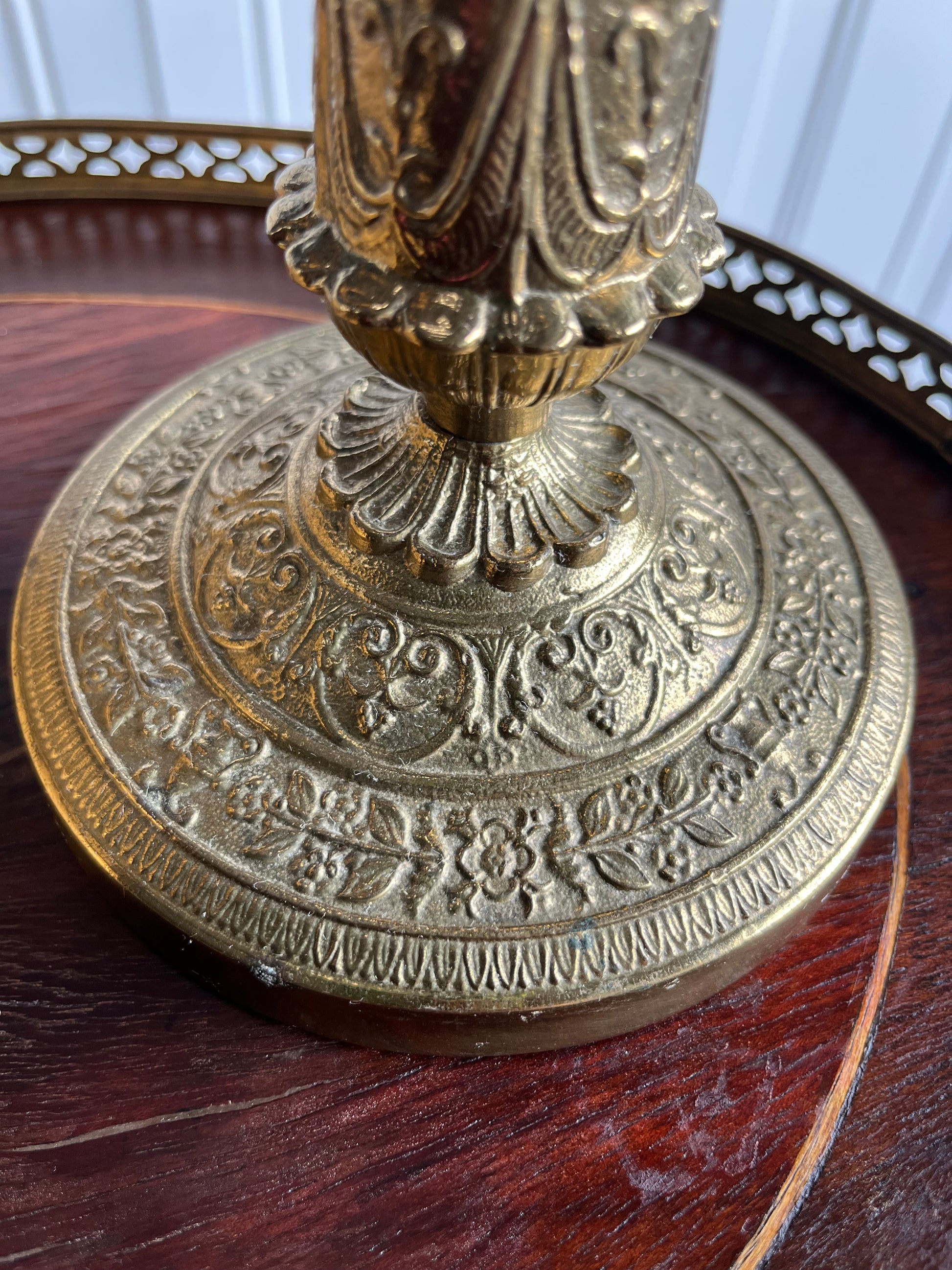 Classic, stately, and richly detailed, this vintage neoclassical table lamp brings a sophisticated glow to any space. With its tall black column, fluted detailing, and ornate gold-toned base, it evokes the timeless charm of Maison Jansen interiors and early Ralph Lauren style—equal parts refined and grand.