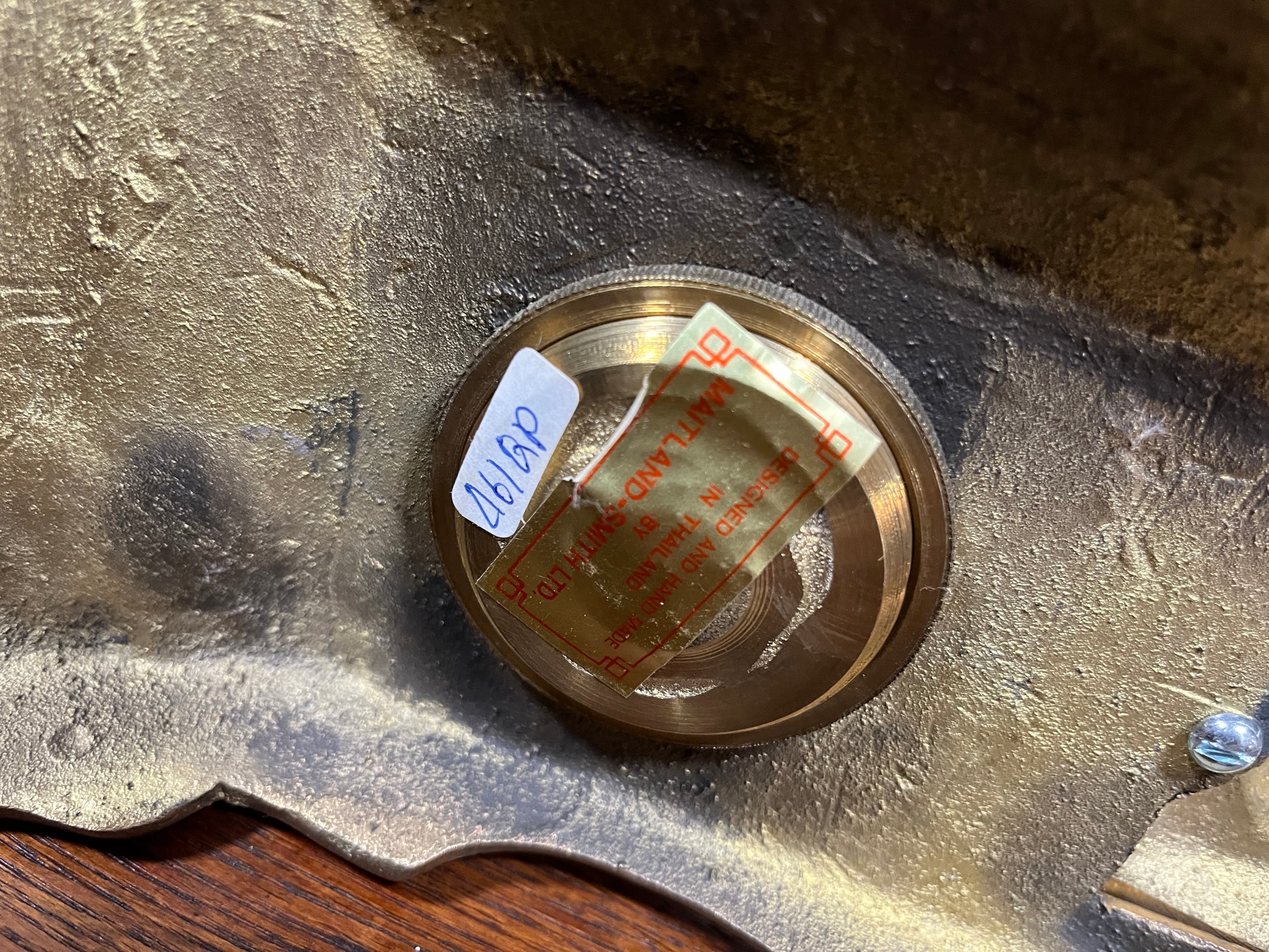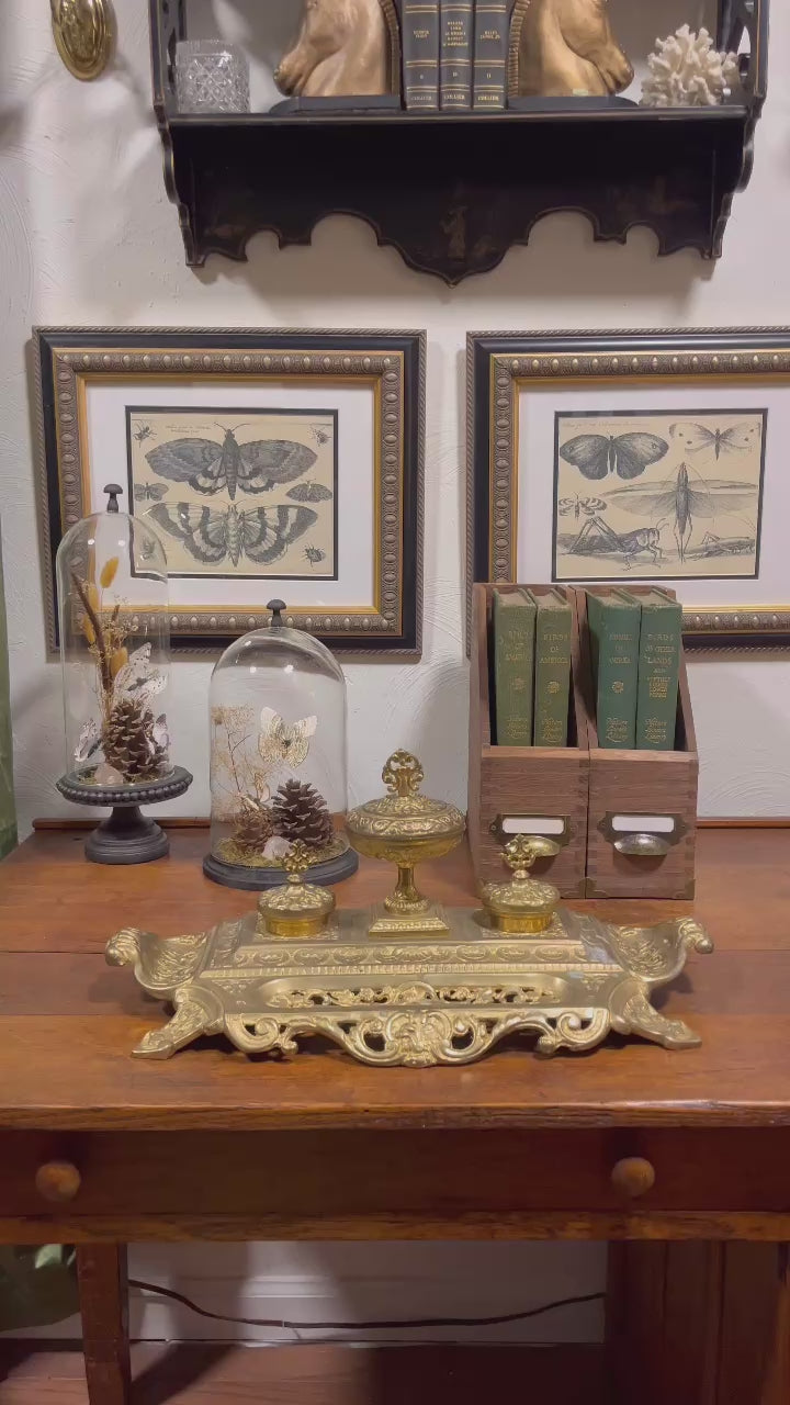 This Maitland-Smith brass inkwell desk set is both functional and decorative, designed with two lidded compartments for ink storage and a central dish that likely served as a receptacle for melted wax or sealing tools, essential for traditional correspondence. The detailed brass construction is sturdy and ornate, making it a striking addition to any desk or display. The removable components allow for easy maintenance, and while the inkwells are perfect for their original use, the set can also serve as a unique organizer for modern desk items. The brass patina adds to its vintage charm but can be polished for a brighter finish, depending on your preference. Ideal for collectors, enthusiasts of antique deskware, or as a sophisticated statement piece.
