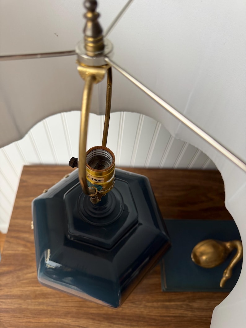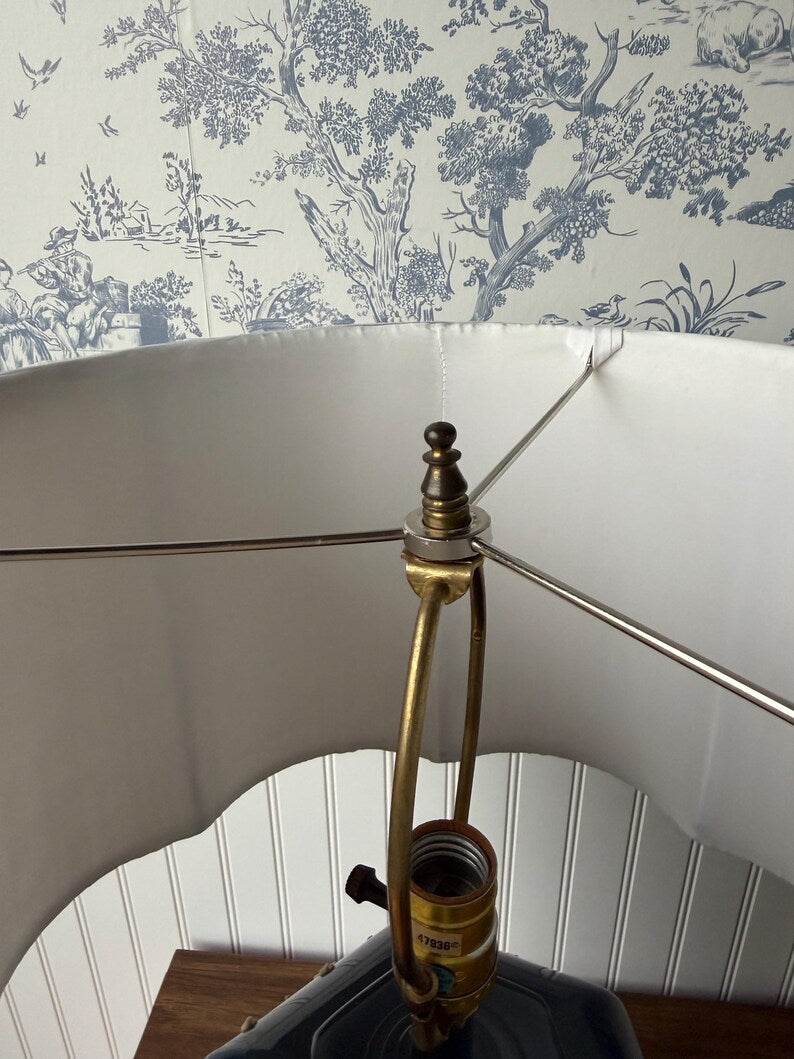 Paired with a newer pleated shade in a warm oatmeal tone with a subtle clover silhouette and softly scalloped edges the lamp is ready to settle into its next home. Styled on a bedside table, entry console, or layered into a living room vignette, it brings warmth, history, and quiet character to a space—the kind of piece people notice, ask about, and remember.